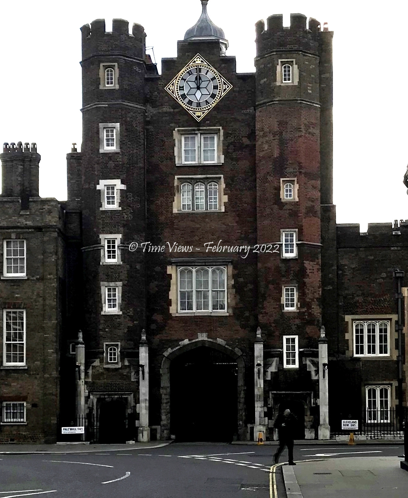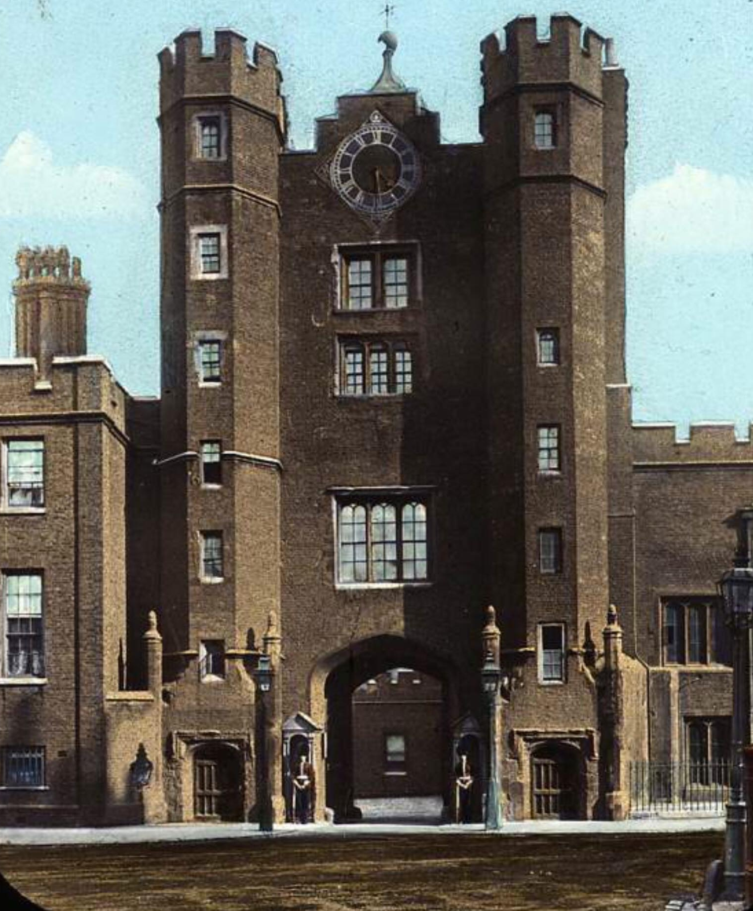 A photograph of an entrance to St. James’s Palace, taken from St. James’s Street. Two guards are posted outside and the street appears to be unmade. I don’t know the date of the photograph but would assume it to be the 1910s.