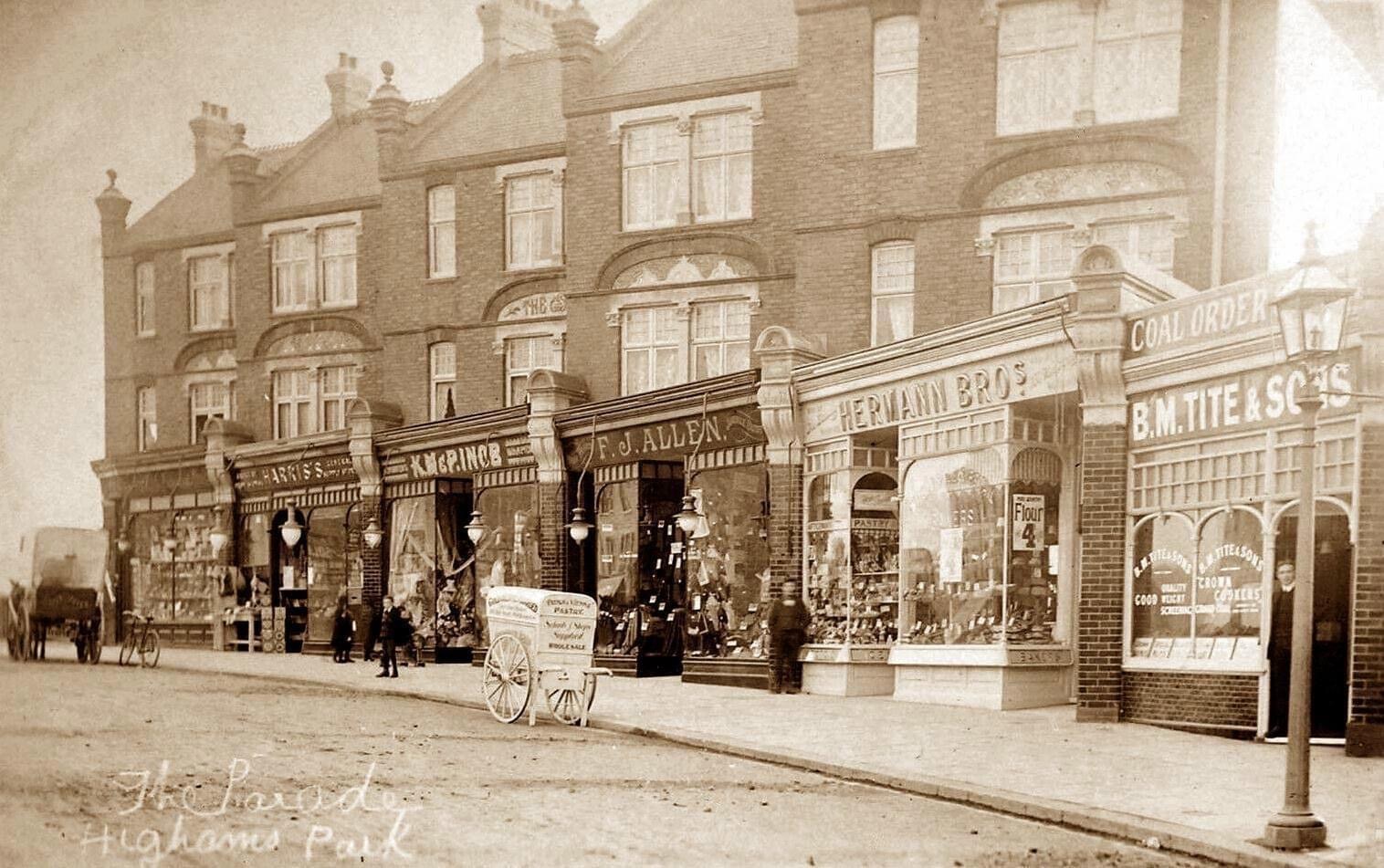 Hale End Road, Highams Park, London An interesting and varied parade of shops in Hale End Road, Highams Park – photographed in around 1900. The Chingford to Liverpool Street railway line is behind the photographer. Image: Photographer unknown (Highams Park Society) The same view on a quiet Sunday morning in February 2021. The disused Regal Cinema can be seen on the left-hand side of the photograph.Image: © Steven Miell (TimeViews) A merged version of the two images above. Use the slider in the centre.